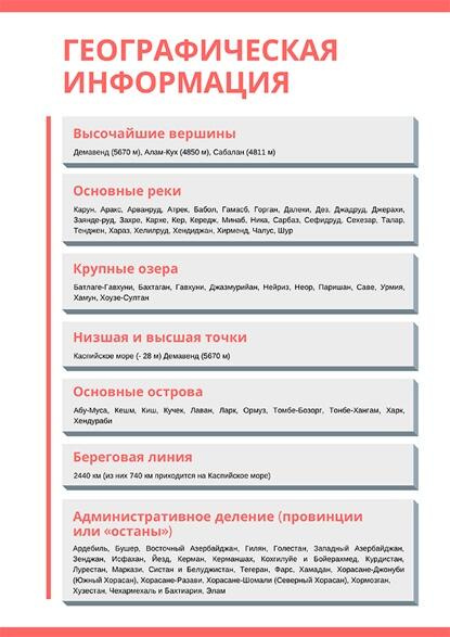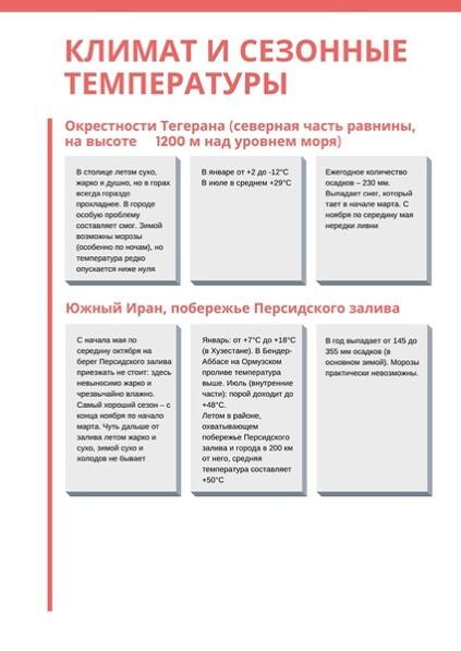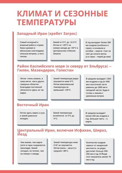 Краткая «климатическая карта» Ирана (см. ниже) поможет вам выбрать сезон для посещения страны и конкретных городов.