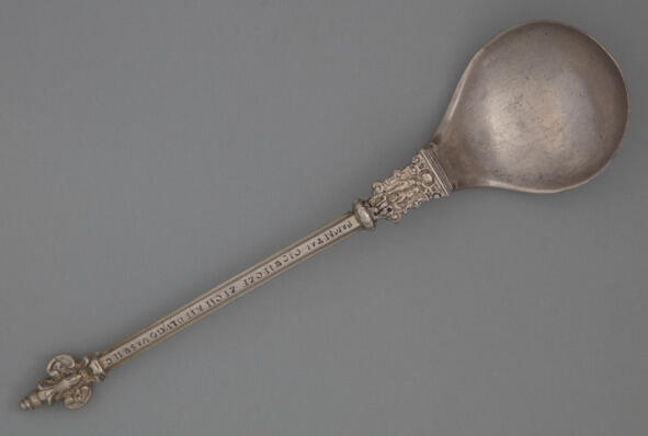 Сярэбраная лыжка XVI XVII стагоддзяў, з польскім рыфмаваным надпісам «Ты запомні чалавек, у цябе нядоўгі век» (пераклад Я.А.). Нацыянальны музей у Кракаве.