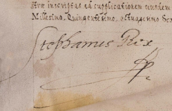 Арыгінальны подпіс Баторыя на дакуменце: Stephanus Rex (Стэфан Кароль). Гродна, 1586 год. Бібліятэка Чартарыйскіх.