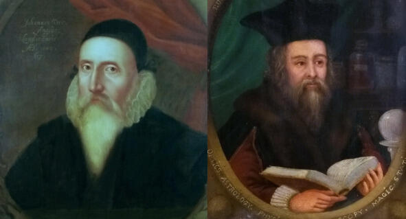 Джон Дi (злева) і Эдвард Кэлі. Калаж аўтара. Арыгіналы ў Музеі Ашмолу і Лонданскім універсітэце.