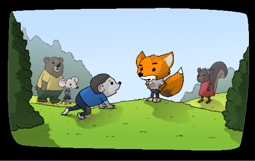Лисёнок побежал на полянку. Ёжик стоял в кругу друзей и рассказывал историю о том, как он ездил к тёте в прошлое воскресенье.