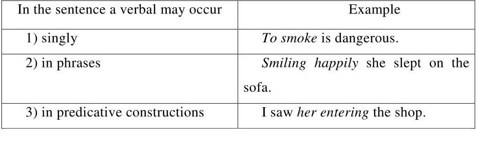 b) in phrases, i. e. with one or several accompanying words (an object or an adverbial modifier to the verbal). The phrases form syntactic units serving as one part of the sentence.