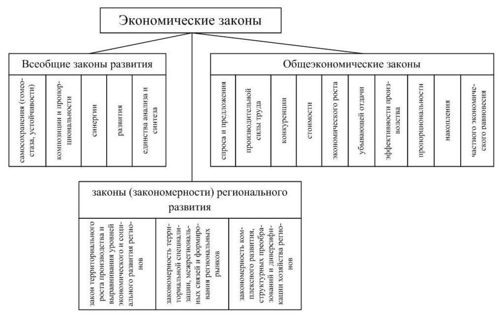 Особую группу экономических законов, обусловленную спецификой сферы действия, составляют законы (закономерности) регионального развития. Кистанов В. В., Н. В. Копылов выделяет закон территориального роста производства и выравнивания уровней экономического и социального развития регионов, закон территориальной специализации, межрегиональных связей и формирования региональных рынков, закон комплексного развития, структурных преобразований и диверсификации хозяйства регионов и т.д. [64].