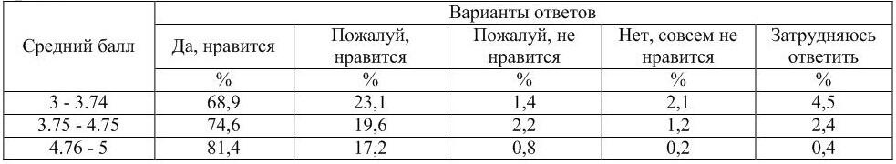 Таблица 1.2 Отношение выпускников к полученной специальности (% от числа ответивших в группе) в зависимости от среднего балла