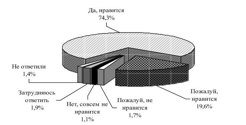 Большинство выпускников (74,3 %) заявили, что им нравится выбранная специальность. Далее ответы респондентов распределились следующим образом: 19,6 % пожалуй, нравится, 1,7 % пожалуй, не нравится, 1,1 % нет, совсем не нравится, 1,9 % выпускников затруднились ответить.