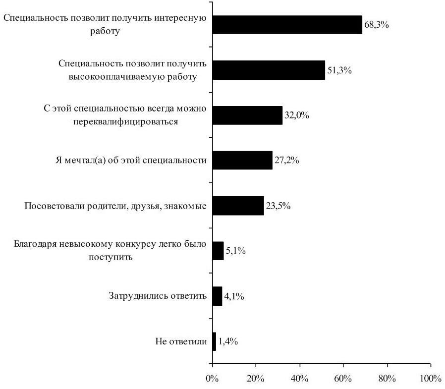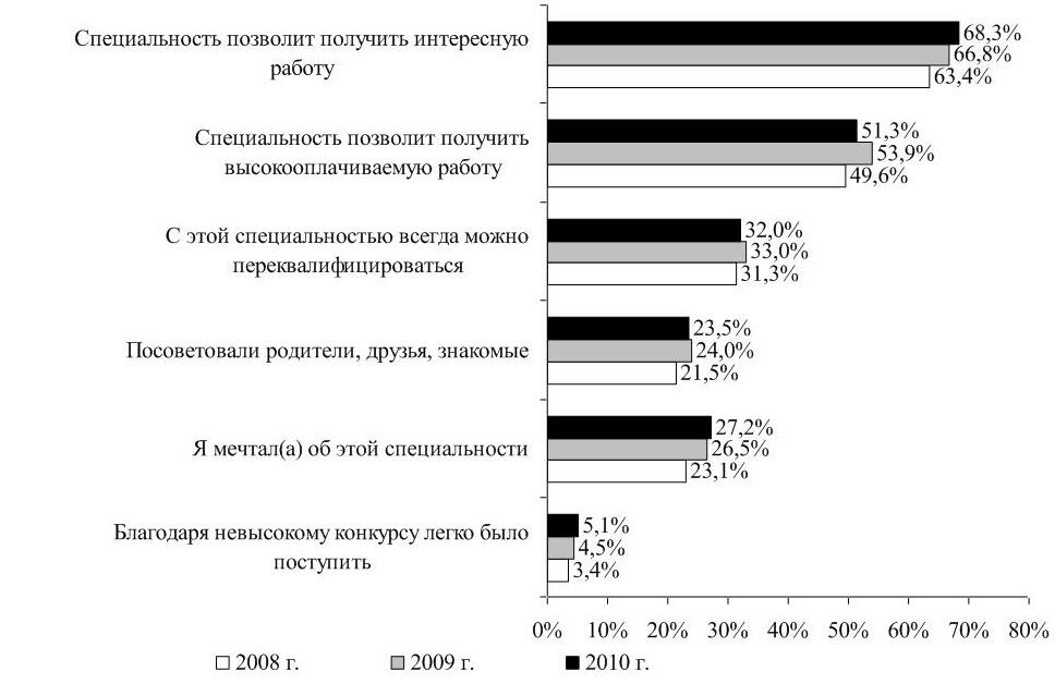 Сравнительный анализ причин выбора специальности респондентами за период 2008 2010 гг. свидетельствует о том, что по-прежнему большинство выпускников выбирают специальность потому, что она позволит им получить интересную (2009 г. 66,8 %, 2010 г. 68,3 %) и высокооплачиваемую работу (2009 г. 53,9 %, 2010 г. 51,3 %). Также у респондентов сохраняется уверенность в универсальности выбранной профессии, и они считали и считают, что с полученной специальностью всегда можно переквалифицироваться (2009 г. 33,0 %, 2010 г. 32,0 %). Попрежнему неизменным остается доля выпускников, мечтавших получить выбранную специальность (2009 г. 26,5 %, 2010 г. 27,2 %).
