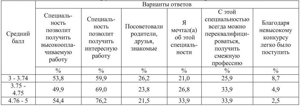 Таблица 1.1 Причина выбора специальности выпускниками (% от числа ответивших в группе) в зависимости от среднего балла