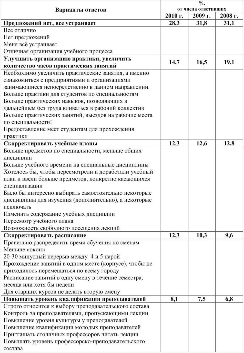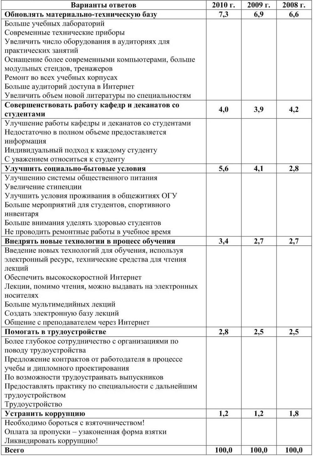 Большинство выпускников 2010 года (28,3 %) учебный процесс в ОГУ полностью устраивает и предложений по его корректировке они не высказали. Значительная доля выпускников (14,7 %) высказали предложение улучшить организацию практики, увеличить количество часов практических занятий. 12,3 % респондентов заинтересованы в корректировке учебных планов и учебного расписания. Также среди предложений выпускников по корректировке учебного процесса в ОГУ были: повышать уровень квалификации преподавателей (8,1 %), обновлять материально-техническую базу университета (7,3 %), улучшить социально-бытовые условия (5,6 %), внедрять новые технологии в процесс обучения (3,4 %).