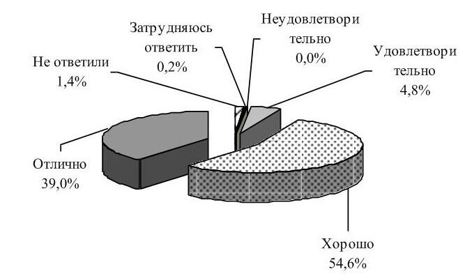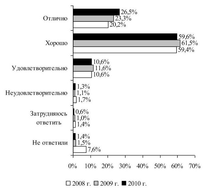 Мониторинг ответов выпускников 20082010 гг. показал, что с каждым годом растет доля выпускников, оценивающих организацию учебного процесса на хорошо и отлично: 2008 г. 79,6 %, 2009 г. 84,8 %, 2010 г. 86,1 %.