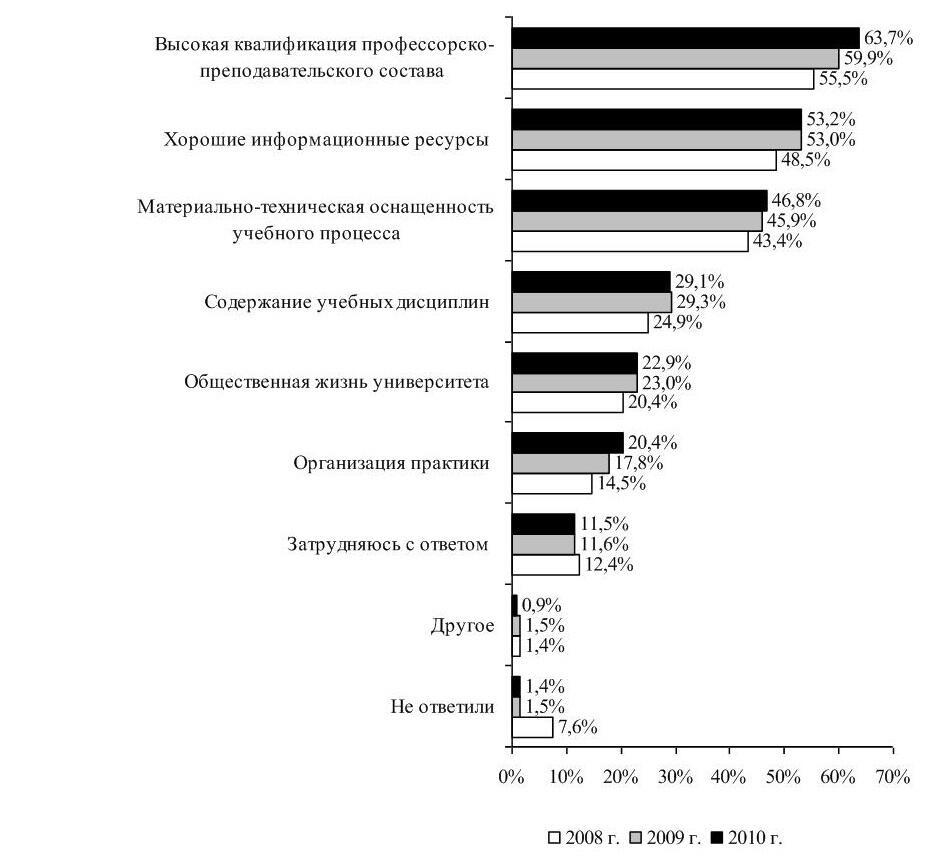 Анализ ответов выпускников 2008-2010 гг. показал, что большинство респондентов разных лет выпуска среди наиболее сильных сторон деятельности университета выделяют высокий уровень квалификации профессорско-преподавательского состава, хорошие информационные ресурсы и высокий уровень материально-технической оснащенности учебного процесса.
