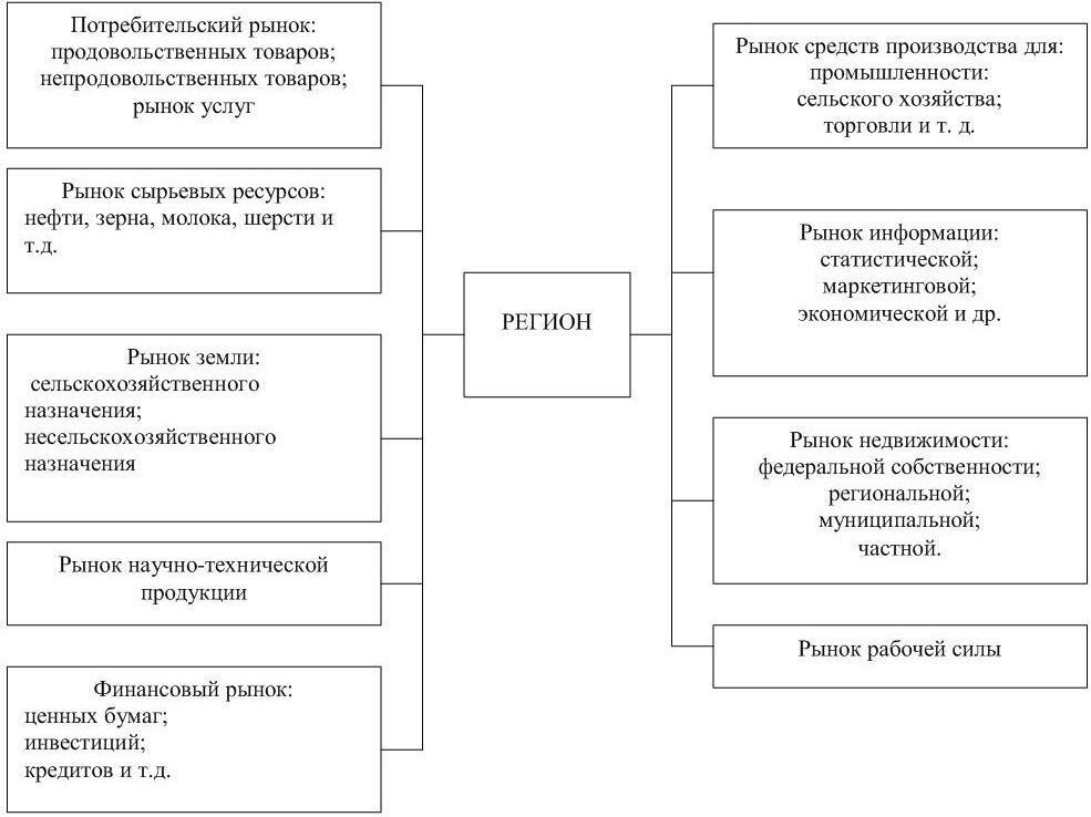 Данные рынки участвуют в кругообороте материально-вещественных ресурсов, финансово-кредитных, информационных и др., регулируя экономические отношения между хозяйствующими субъектами. Все региональные рынки тесно связаны между собой как внутрирегиональными, так и межрегиональными связями, имеют сложную структуру и особенности. Например, каждому типу рынка присущи свои субъекты, объекты, инфраструктура, стратегии развития. Национальные и международные рынки имеют также свои специфические особенности.