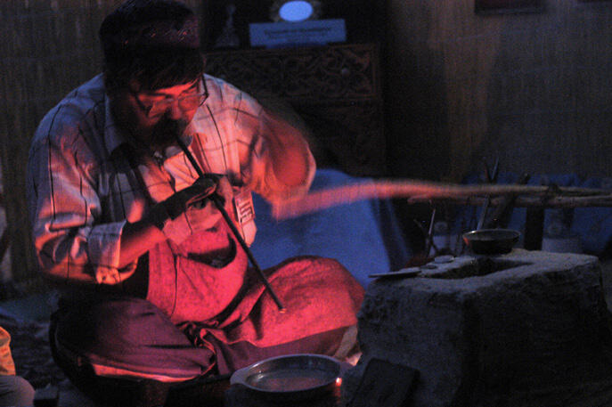 В его творческой обители мастерской дүкен, шеберхана еще строже должна была соблюдаться дисциплина мыслей и чувств. В сознании казахов, мастерская, в которой наковальня соотносится с идеями неба, с космическим миропорядком, считается сакральным местом, как и у других народов мира [2, с. 42].