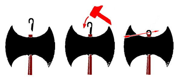 Достаточно вспомнить маленькую деталь. Чтобы топор держался на топорище, в верхушку последнего вбивают гвоздь и загибают. Мы предположили, что древнегреческий оружейник не глупее русского мужика. А также, что длинные рукояти боевых секир, как и древка копий, делались из легкого дерева, а не из тяжелого и, главное, дорогого металла. Соответственно, в верхушку каждой рукояти в обязательном порядке должен был вбиваться распорный гвоздь (или, скорее, клин) с загнутым верхом. Либо верх можно загнуть после этого неважно. Важно, чтобы он был загнут по кольцу, тогда загиб не будет иметь слабых мест и не сломается при ударе. Поглядите-ка на рисунок 1: вот оно, таинственное отверстие!