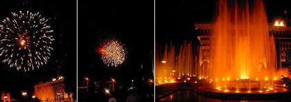 Вся наша группа собирается на ступеньках исторического музея. Ждём наступления темноты. Смотрим, как преображаются здания в загорающихся огнях иллюминации. И вот прогремел первый залп! Небо засветилось множеством огней, площадь огласилась восторженными криками! Залп второй, третий, четвёртый Мощными струями разлетаются в небе огни. Красиво!