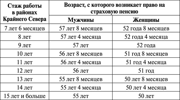 Законом предусмотрена возможность назначения пенсии со снижением пенсионного возраста пропорционально имеющемуся стажу. Для этого требуется не менее 7 лет 6 месяцев работы в районах Крайнего Севера. В этом случае страховая пенсия назначается с уменьшением пенсионного возраста (60 лет для мужчин и 55 лет для женщин) на четыре месяца за каждый полный календарный год работы в этих районах.