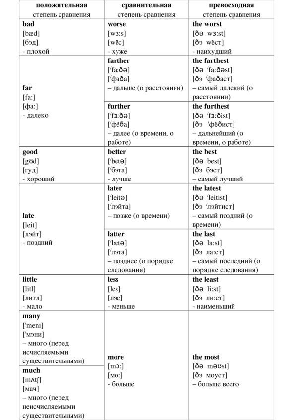 Исключения из правил формирования степеней сравнения прилагательных приведены в следующей таблице: