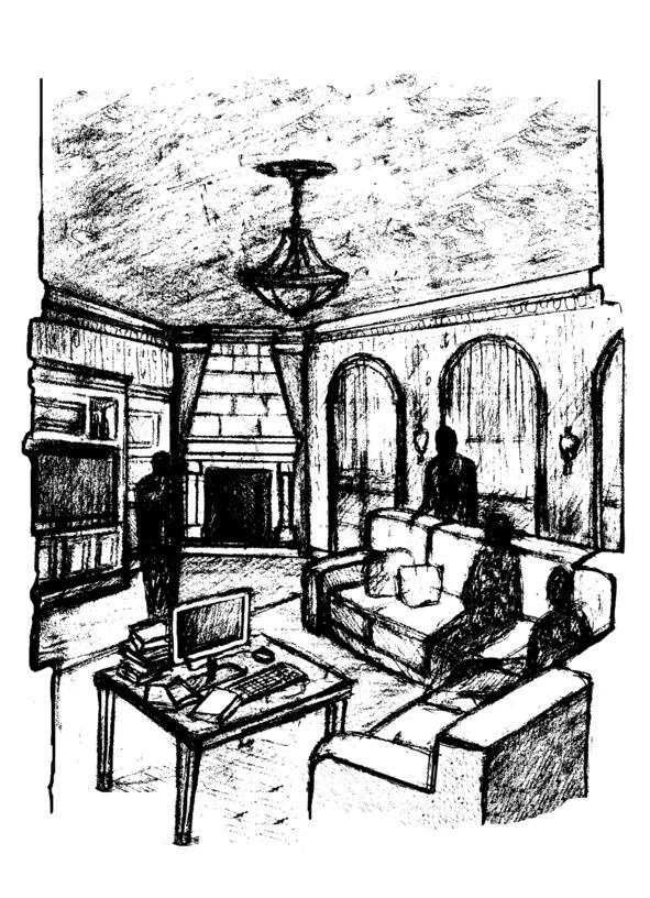 Ребята стали осматривать гостиную, которая была довольно просторной: в углу располагался старый камин, по стенам картины современных авторов, кожаный диван занимал всю правую сторону гостиной. В центре стоял стол, на котором были книги и монитор, судя по всему, выключенный.