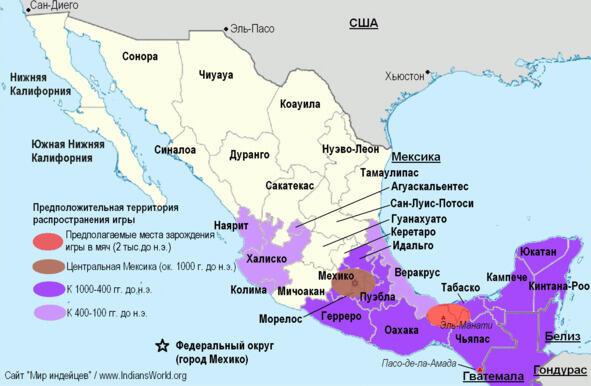 Однако, по мнению многих учёных, основными претендентами на звание родоначальников игры в мяч являются жившие на перешейке Теуантепек так называемые древние, археологические ольмеки.3 Побережье Мексиканского залива (штаты Веракрус и Табаско) основной источник каучука, следовательно, там существовали наиболее благоприятные условия для возникновения игры. В долине реки Коацалькоалькос находится городище Эль-Манати, которое связано с ранней историей древних ольмеков. Там были найдены двенадцать каучуковых мячей, причем пять из них обнаружены местными жителями в источнике пресной воды. Размер мячей варьируется от 8 до 22 сантиметров в диаметре, самые меньшие из них датируются 17001600 годами до нашей эры. Это наиболее древнее свидетельство существования игры в мяч, примечательно, что в одном из погребений в Эль-Манати местные жители также обнаружили каменный «хомут» один из традиционных элементов снаряжения игрока. Многие мячи найдены археологами среди ритуальных подношений, следовательно, уже в то далекое время ольмеки наделяли игру сакральным смыслом.