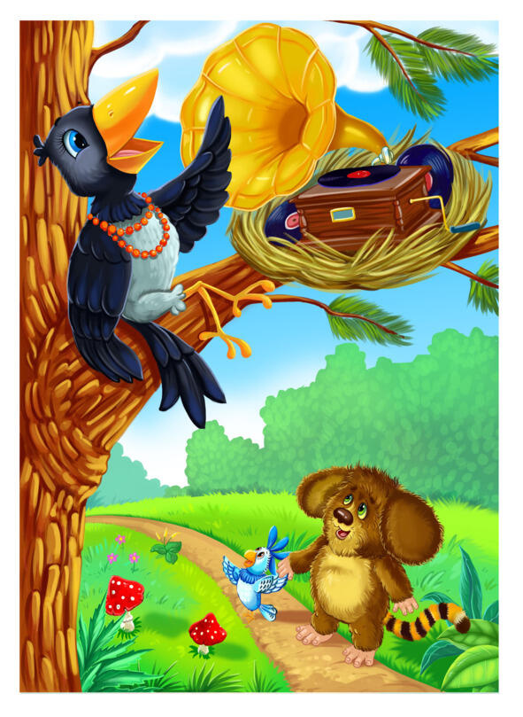 На самой высокой сосне поселилась лохматая меломанка ворона Рафаэлла Кар-Карала. Огромное и уютное гнездо сделано прямо около скворечника, в котором хранились самые дорогие вещи вороны старый ржавый патефон и несколько таких же пластинок, которые Рафаэлла знала наизусть и распевала каждую ночь напролет. Она летала над гнездом и думала: «Красота! Я среди звезд как самая яркая комета. Скоро весь мир узнает и оценит мой звездный талант».