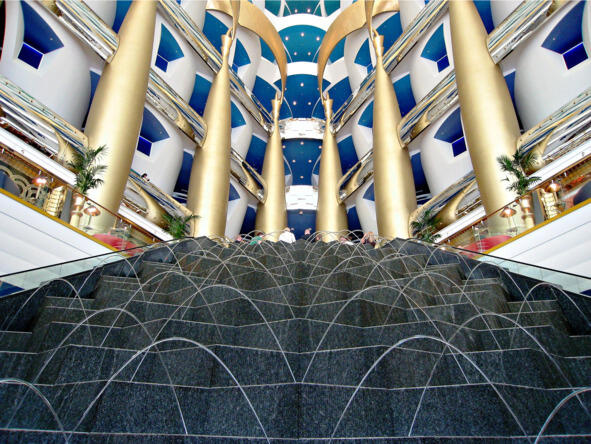 Но Бурж Аль Араб архитектурное чудо не только снаружи, но и внутри. Его интерьеры уникальны и неповторимы. А одной из главных достопримечательностей отеля выступает каскадный фонтан, украшающий 180 метровый атриум, созданный стараниями знаменитого дизайнера Хуана Чу (Khuan Chew). Действительно, самый высокий атриум в мире поражает воображение своей роскошью. Многоступенчатый каскадный фонтан, струи которого, то переплетаются причудливой арабской вязью, то начинают прыгать и играть на ступеньках, чудесным образом поспевая за ритмом мелодии и сверкая разноцветными огнями подсветки. Органичность этого фонтана в столь роскошных интерьерах изумительная.