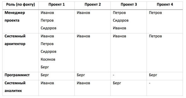 Ниже пример таблицы, которая может получиться в результате. Не надо пугаться, на практике в проектах, к сожалению, бывает по 3 менеджера, 5 архитекторов и 1 программист.