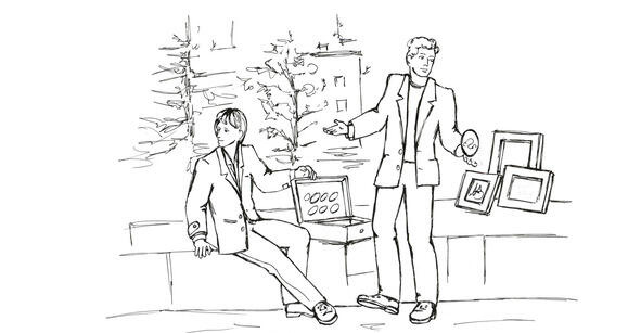 В своём чемоданчике Сергей приносил пару-тройку небольших пейзажей, написанных ещё зимой, до того как он начал делать лаковые украшения. Поставив картины на парапет площадки, Сергей раскладывал небольшой бархатный коврик, а на коврик выкладывал украшения.