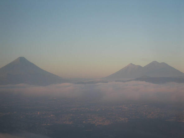 Но есть и минус: высокая сейсмичность. Один из наиболее активных вулканов планеты Пакайя давший о себе знать в мае и июне 2010 года, расположен всего в полусотне верст от города Гватемалы. Всего же в стране 37 вулканов. Самый высокий Тахумулько. Выше него 4220 м нет вершин во всей Центральной Америке. Сквозь иллюминатор я вижу три вулкана: Акатенанго (3960 м), Фуэго (3763 м) и Агуа (3760 м). Они возвышаются над облаками. Здесь, наверху только они. Город, оставшийся внизу, кажется настольной игрой, в которую эти три богатыря разрешили человеку пока поиграть.