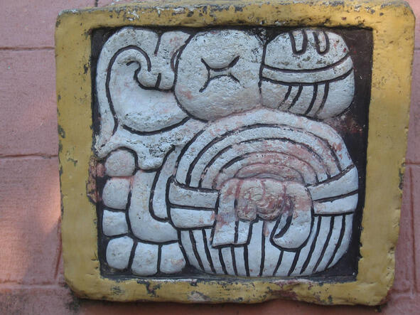 Сразу у входа находится каменная плита, где на языке майя написано «Государство-город Тикаль». Здесь пять символов. Самый крупный тот, что в правом нижнем углу означает «город-государство». Это фактически иероглиф: один знак, пусть и сложный, передает некое понятие. Символ в левом нижнем углу передает слово и слог «ти», означавший «место» (сравним с Та-Итца «Место народа итца»). Символ слева вверху это определенный артикль мужского рода. Знак в середине вверху передавал у майя обычно слог «ах» или звук «к». Получаем «ти-к». И наконец символ в правом верхнем углу передавал звучание «аль». Получаем «Ти-к-аль» (с несколько раздельным произношением слогов, что свойственно и современным языкам, являющимся потомками майя киче, какчикель, цутуиль, мам, и другим). Плита эта сделана учеными. Напомним, подлинное название Тикаля Мутуль.