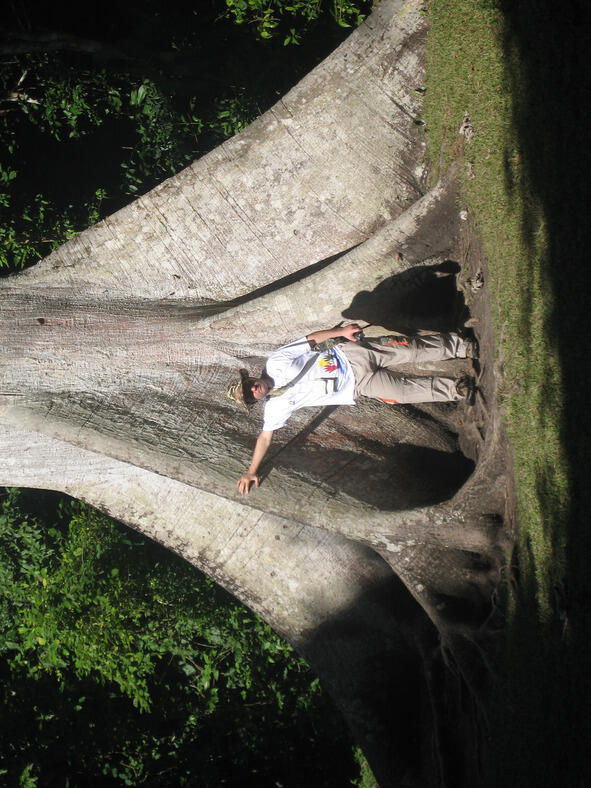 К самим руинам ведет довольно ровная проселочная дорога. Престарелые туристы садятся в пикап на скамейки, а кто-то и соглашается ехать стоя. Идти немало. Войдя в лес, вскоре слышу лай. Собаки? Нет, это обезьяны-ревуны. Оказывается, они еще и лают. Вдоль обочины цепочкой протянулись туристы, пытаясь увидеть хотя бы одного ревуна. Но не тут то было. Через пару сотен метров на придорожной поляне не могу не остановиться: сейба. Такое дерево не каждый день встретишь.