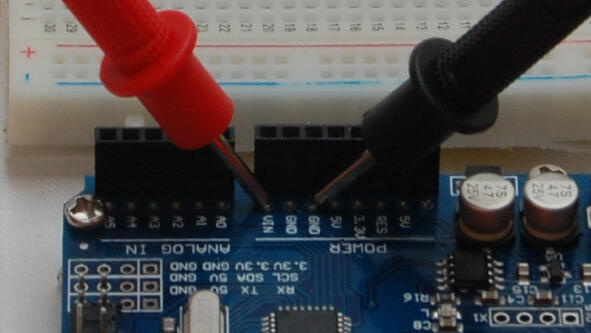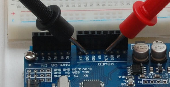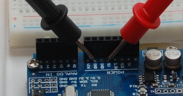 Загорится красный светодиод. Измерьте напряжение, поступающее на плату от Кроны. Черным щупом коснитесь пина GND, а красным пина Vin.
