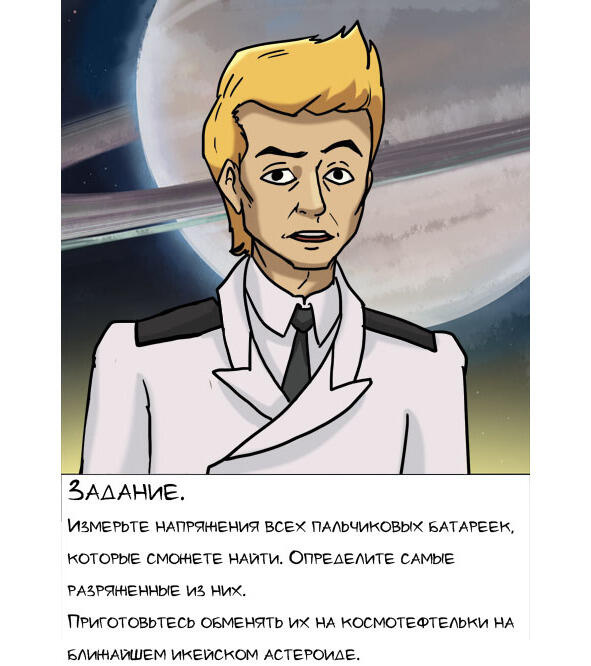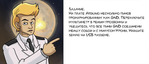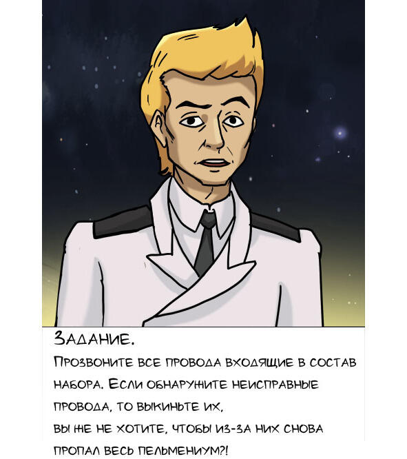 Внимание! Ни в коем случае не засовывайте щупы в розетки космического корабля! Это опасно для жизни! Без шуток.