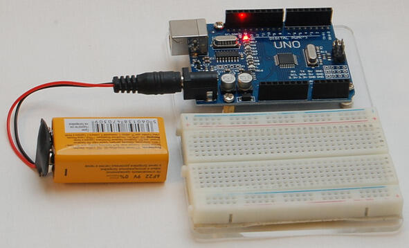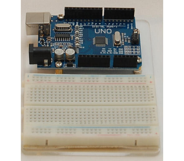 Макетная плата или «макетка», как ее иногда называют, предназначена для установки электронных компонентов. Для удобства в работе макетку лучше всего приклеить на подложку рядом с платой Arduino. Плату Arduino прикрутите винтиками или приклейте на толстый слой двустороннего скотча.