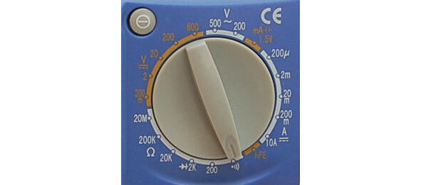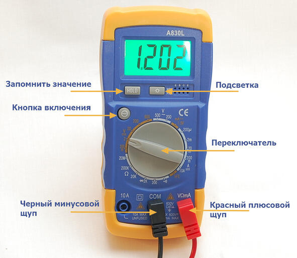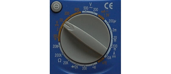 На рисунке переключатель показывает на 20. Это означает, что в этом режиме мы сможем измерить напряжение от 0В до 20В. Для того чтобы измерить напряжение Кроны следует коснуться черным минусовым щупом отрицательной клеммы Кроны (), а красным щупом положительной клеммы (+).