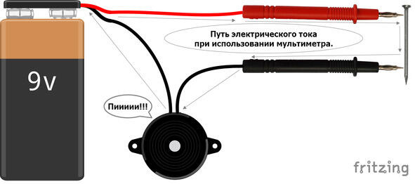 Коснитесь щупами друг друга. Раздастся писк! Это означает, что цепь замкнута и по ней протекает электрический ток. Ток вытекает из плюсовой клеммы Кроны, установленной в мультиметре, протекает по красному щупу, затем по черному, попадает в зуммер, который издает пронзительный писк, а потом снова затекает в Крону через минусовую клемму. Крона хитрым химическим способом снова разгоняет ток, и он опять вытекает из ее плюсовой клеммы.