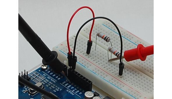 Переключите мультиметр в режим вольтметра и измерьте напряжение между землей (GND) и точкой соединения резисторов.