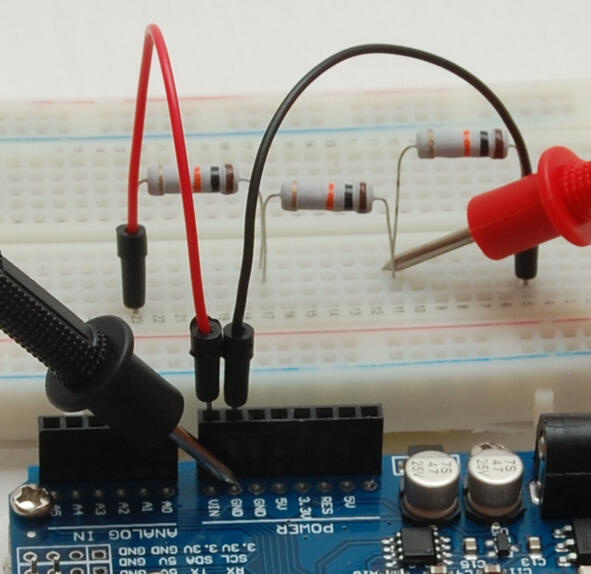 Переключите мультиметр в режим вольтметра и измерьте напряжение между землей (GND) и точкой соединения первого и второго резисторов.
