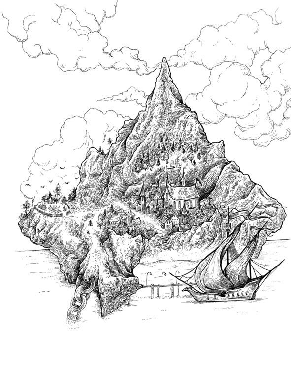 Но не только цепь была сомнительным подарком новых владельцев плавучей скале. После того, как короля Римрила вынудили покинуть трон в пользу старшей сестры больше десяти лет назад, они прибыли сюда аристократы, ученые, торговцы, главы расформированных гильдий, служители искусства, мастера всех мастей, бродяги и разбойники. Они основали поселение, которое затем выросло в большой город, не похожий ни на какой другой благодаря главному закону: никто и никогда не должен спрашивать другого о его прошлом.