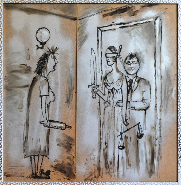 Чешков наш давний хороший друг, юрист. Артур подарил ему картину, три персонажа на картине: разъяренная жена (в бигудях и скалкой в руке, этакая фрекен Бок), сам лукаво улыбающийся Чешков в дверях (точно угадывающийся на картине, хотя, повторюсь, портретного сходства никакого, но безупречно воспроизведен образ), заявившийся заполночь в обществе юной прелестницы. У прелестницы на глазах повязка, в одной руке меч, в другой весы. Богиня, т.е., правосудия.