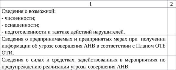 Представляемые сведения при получении анонимной информации об угрозе совершения АНВ в деятельность ОТИ метрополитена