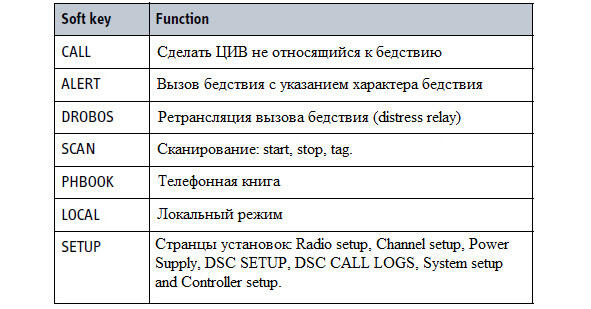 Ряд функций радиостанции SAILOR 6222 VHF DSC осуществляется с помощью четырех функциональных клавиш, расположенных слева от дисплея. (Рис. 5) Текущие функции программируемых клавиш на дисплее отображается рядом с этими клавишами.