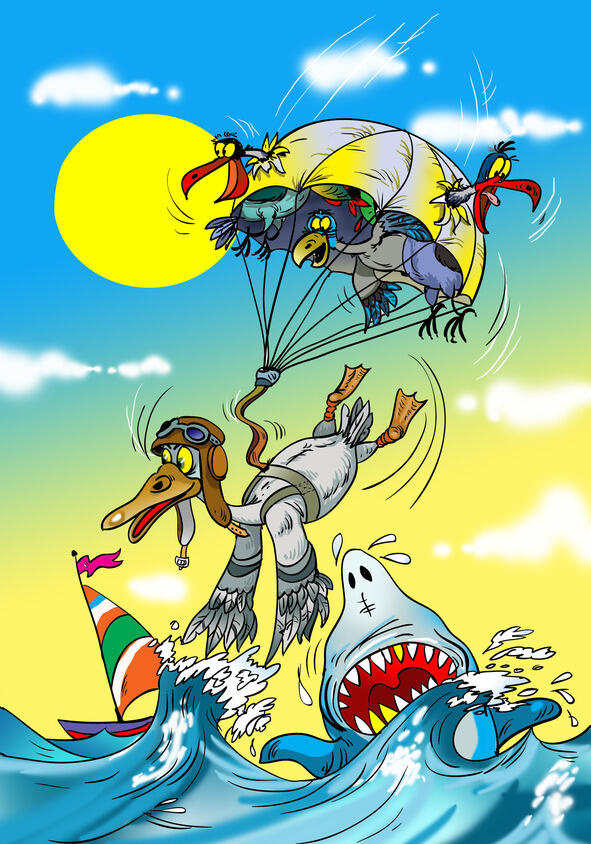 Начала тогда утка снижаться. И тут же в парашют стали попадаться сначала летучие рыбки, а потом и не летучие: он уже в воду погрузился. И пока утка тормозила, залетела в сачок и акула. Всех, кто там был, она поглотала и на утку жадными глазами смотрит. Но утка ничего этого не заметила приводнилась. А как только приводнилась, тут же акула ее и проглотила.