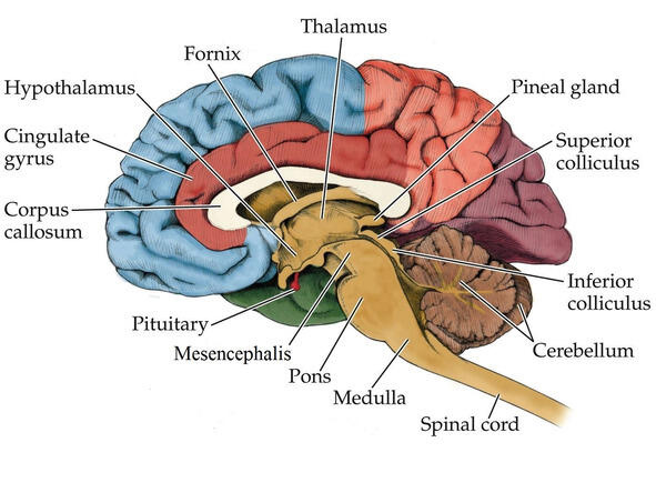 Промежуточный мозг состоит из вентральной или передней части (hypothalamus) и дорсальной или задней части (metathalamus, thalamus, epithalamus).
