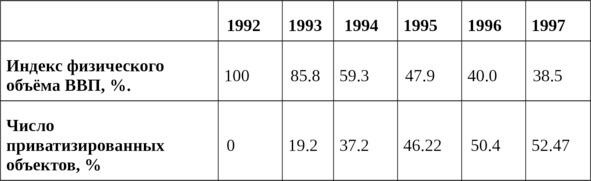 Таблица 1. Сопоставление физического объёма ВВП и темпов приватизации в России