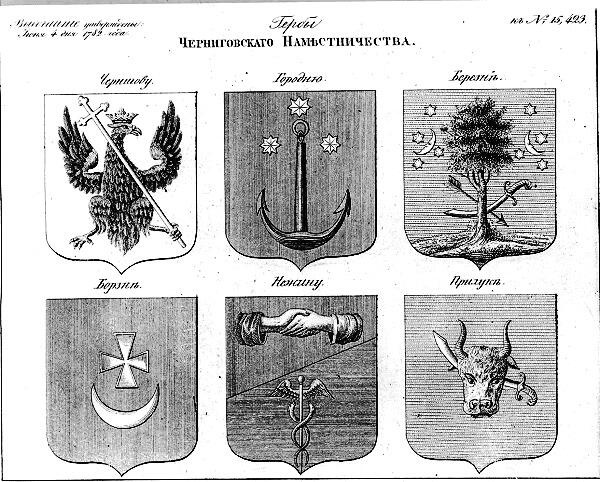 Но вернемся в пределы Российской империи. Первый официально утвержденный российский герб Чернигов получил 4 июня 1782 года: «в серебряном поле черный коронованный орел с позолоченным крестом в левых когтях».