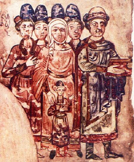 Вот они всей семьей на миниатюре из «Изборника», маленький Ярослав перед матерью.