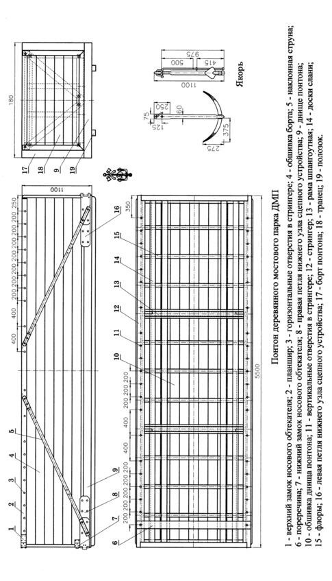 Борт состоял из нижней обвязки, стрингера, двух торцовых стоек, шпангоутов и досок обшивки. Днище включало две боковые и две торцовые обвязки, одиннадцать флор, восемь упорных брусков, 1112 досок обвязки, пять сланей и два полозка. Транцы придавали понтону поперечную жесткость и вместе со шпангоутными рамами, флорами и шпангоутами образовывали поперечный набор понтона. Шпангоутная рама состояла из нижней и верхней распорки, двух стоек и двух парных подкосов. С помощью сцепного устройства производилась стыковка понтонов между собой кормовыми транцами.
