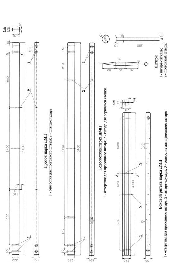 Прогоны изготавливались из бруса изготовленного из сосны или ели, снизу прогона устанавливались два штыря для крепления к стрингеру понтона. Колесоотбои были аналогичны брусам и отличались наличием отверстий для перильных стоек. Настилочные доски по концам имели стесанные кромки для пажильных хомутов.