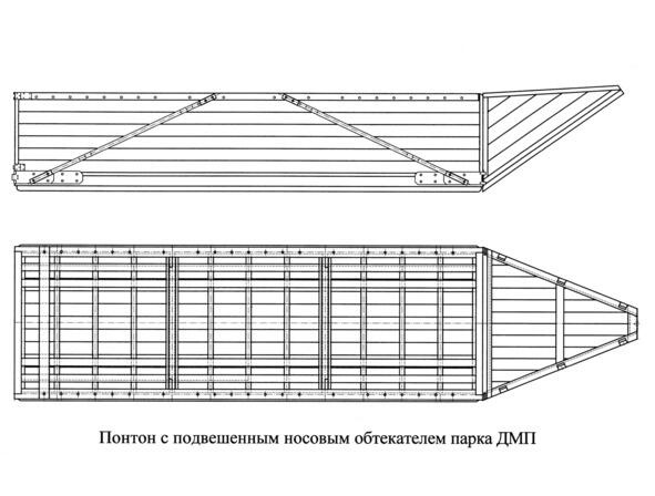 Понтон изготавливался из сосны или ели и представлял собой открытую прямоугольную коробку, состоящую из двух бортов, двух транцев, двух шпангоутных рам и сцепного устройства. Все элементы соединялись болтами и разбирались только во время ремонта.