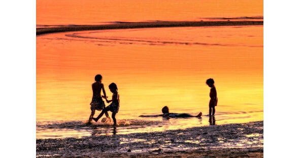 Славка, Лена и Павлик, наконец, открыли глаза и тоже застыли в изумлении. Вместо церкви и сторожа дяди Феди, перед ними лежало ночное бескрайнее море. Огромное оранжевое солнце садилось за далекий горизонт, и золотистая дорожка от него бежала по морю, упираясь в берег, на котором стояли ребята. Малыш растерянно залаял и осёкся.