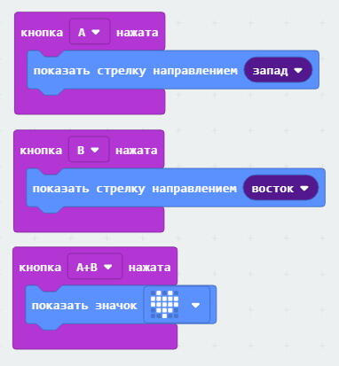 Когда вы нажимаете кнопки A и B, в микроконтроллере возникают так называемые события. Эти события перехватываются блоками кнопка нажата. Если в тело этих блоков добавить другие блоки, то они получат управление при нажатии соответствующей кнопки, или двух кнопок одновременно.